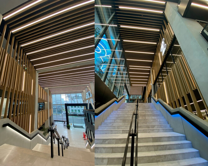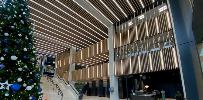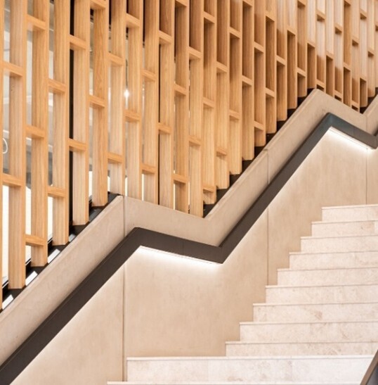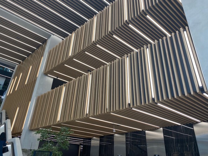 Vulcan Ullrich battens, finished in MetWood Pale Manuka have been installed throughout the main foyer and walk ways connecting the two buildings which comprise Mansons TCLM's latest office building development. The battens have been used extensively on the ceilings and walls.