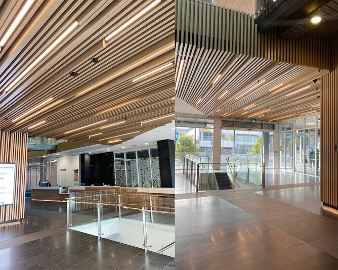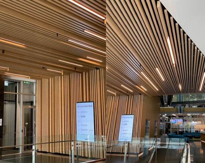 MetWood was used on the internal foyer of the Kordia building in the Auckland CBD. A Pale Manuka finish was chosen to finish the Aliscreen battens to provide an attractive entrance ceiling and wall pattern, that will provide a hard wearing and long lasting timber appearance for this commercial project.