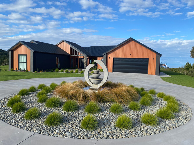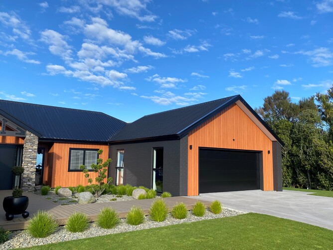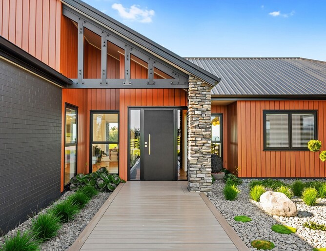 This residential home has been clad in a Flashclad Dualboard 01 finished in a Metwood Light Cool Cedar finish and installed by Cladman, to compliment the schist stone finish and other black powder coated cladding.