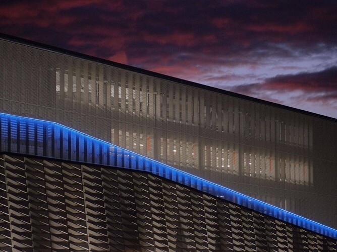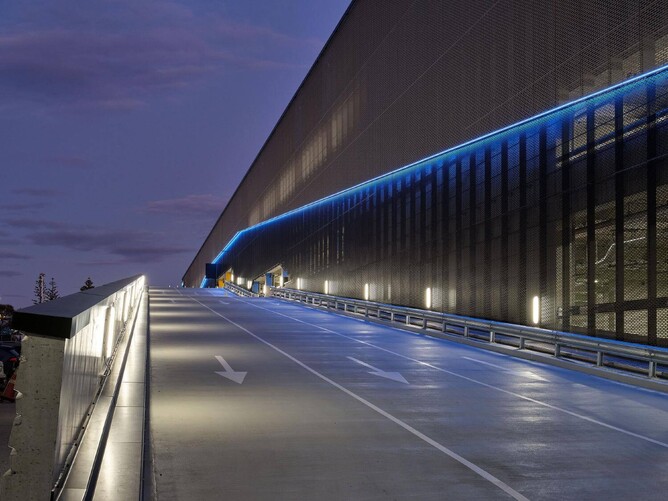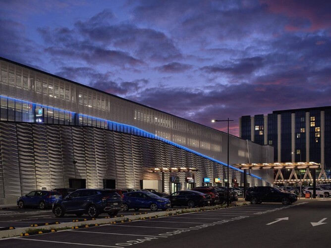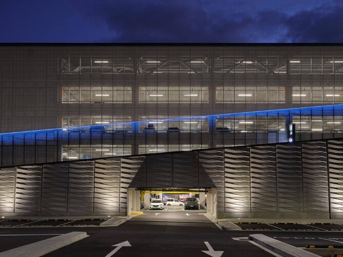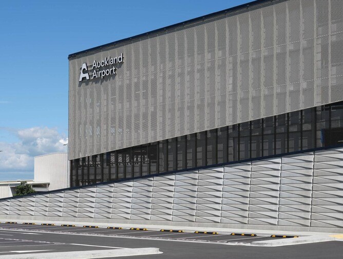 The new Auckland Airport Transport Hub features 8,500m² of perforated aluminium panels, finished in two powder-coated colours.