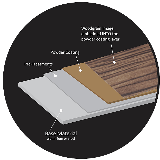 Metwood is a two stage process of powder coating followed by sublimation. Through our suppliers, we are able to offer a 25 year warranty on the underlying powder coating from Interpon, and a 10 year warranty on the pattern from Menphis.